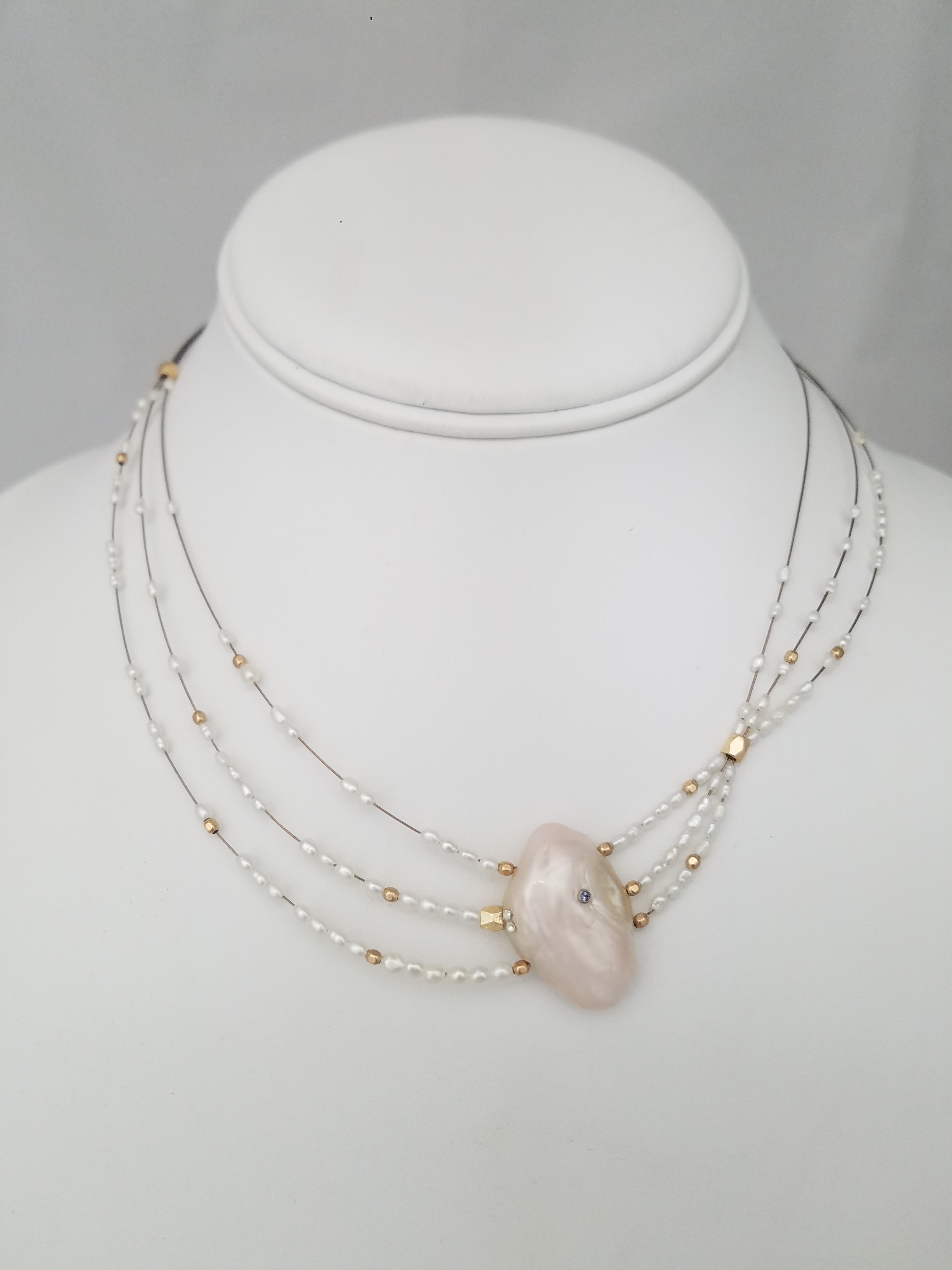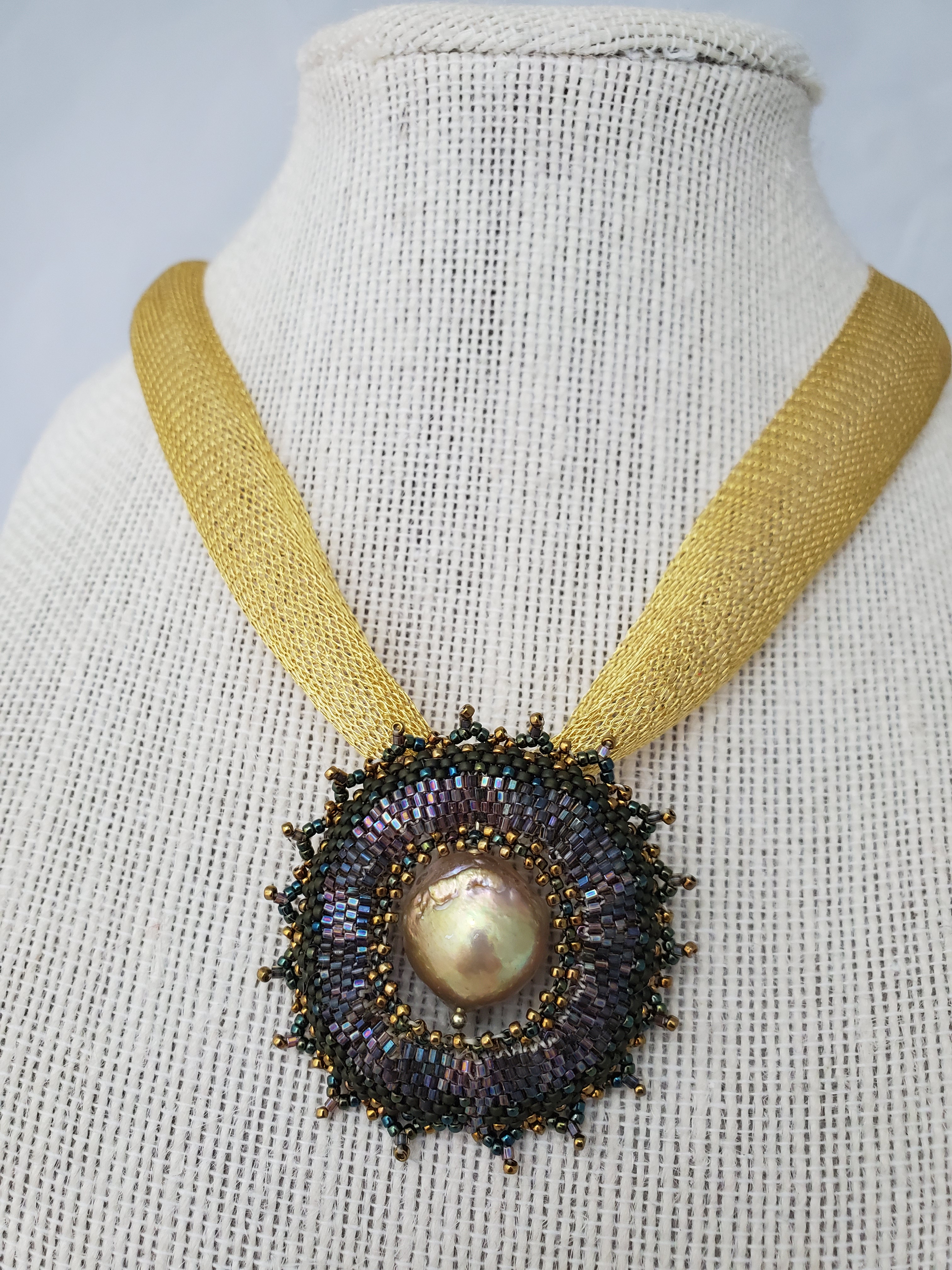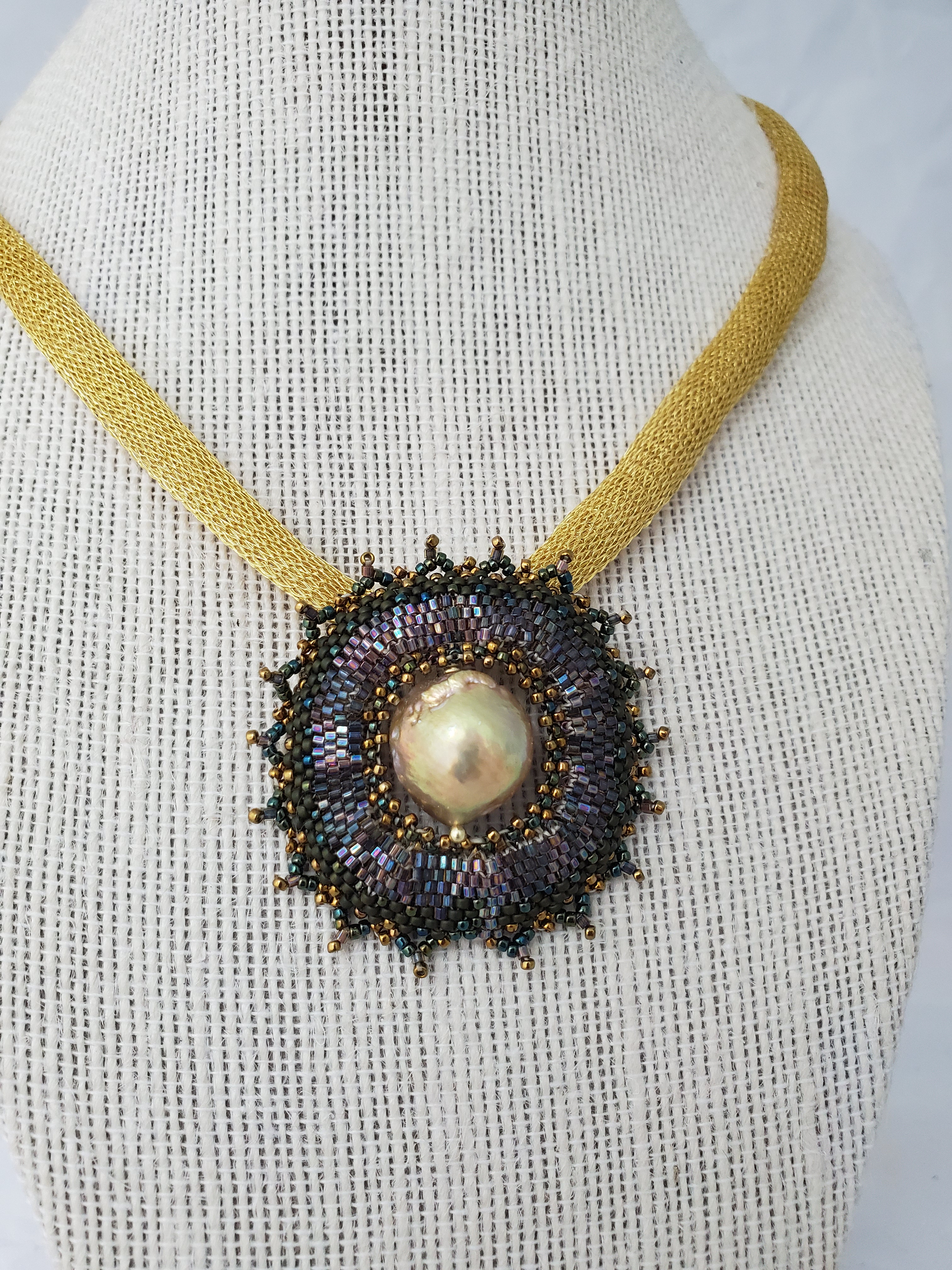 Button, Golden Keshi, metallic and seed pearls on adjustable gold fill flat cable chain.