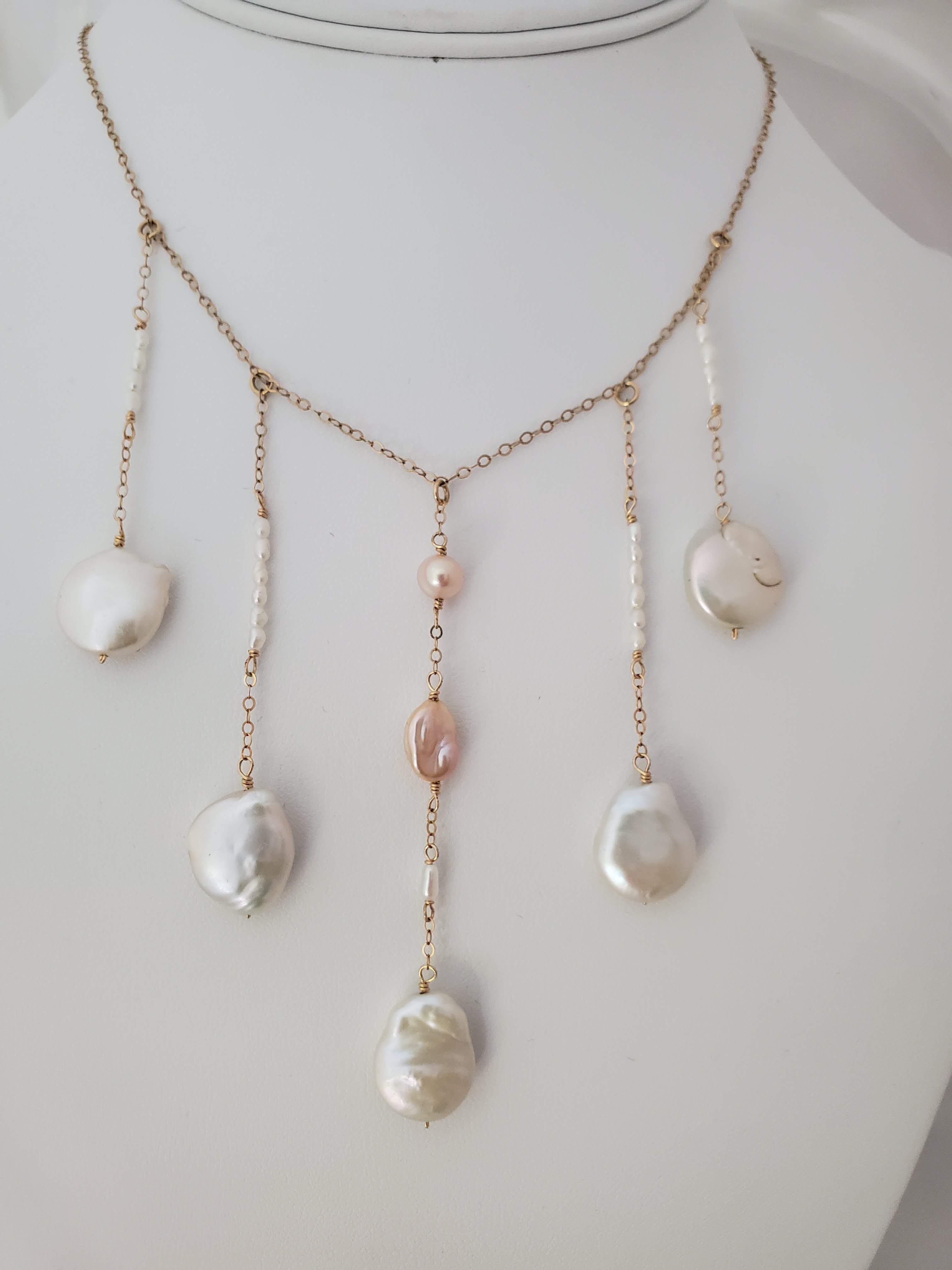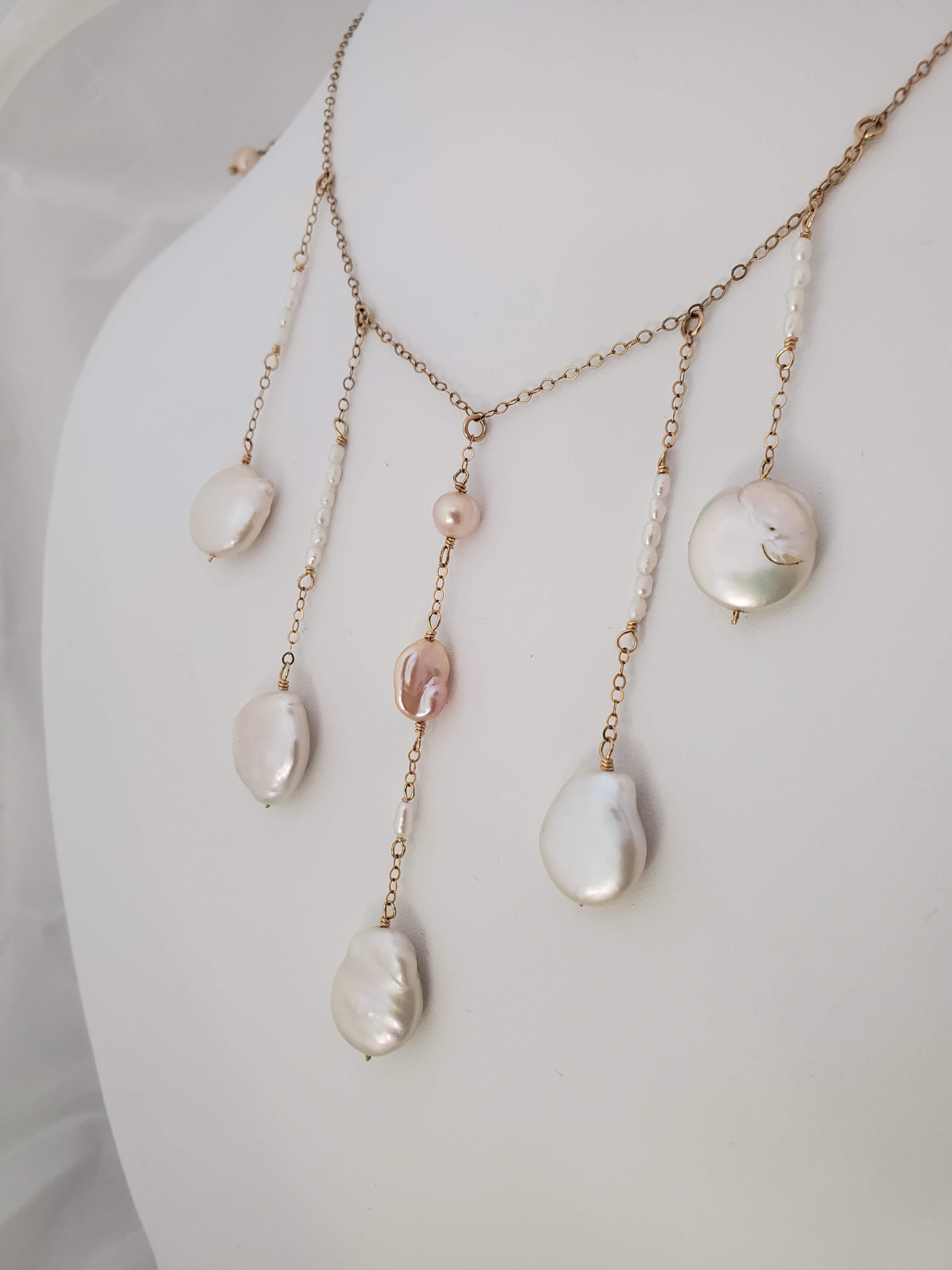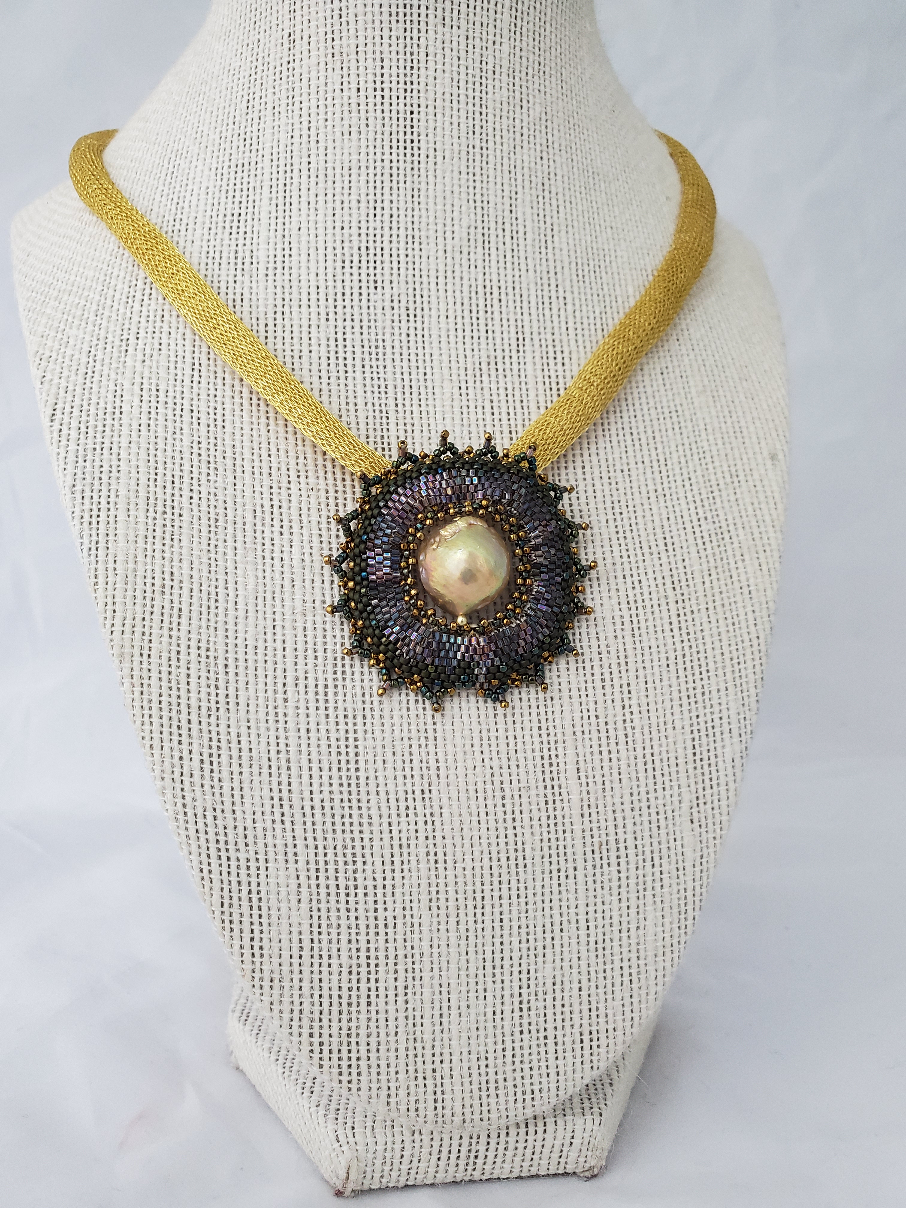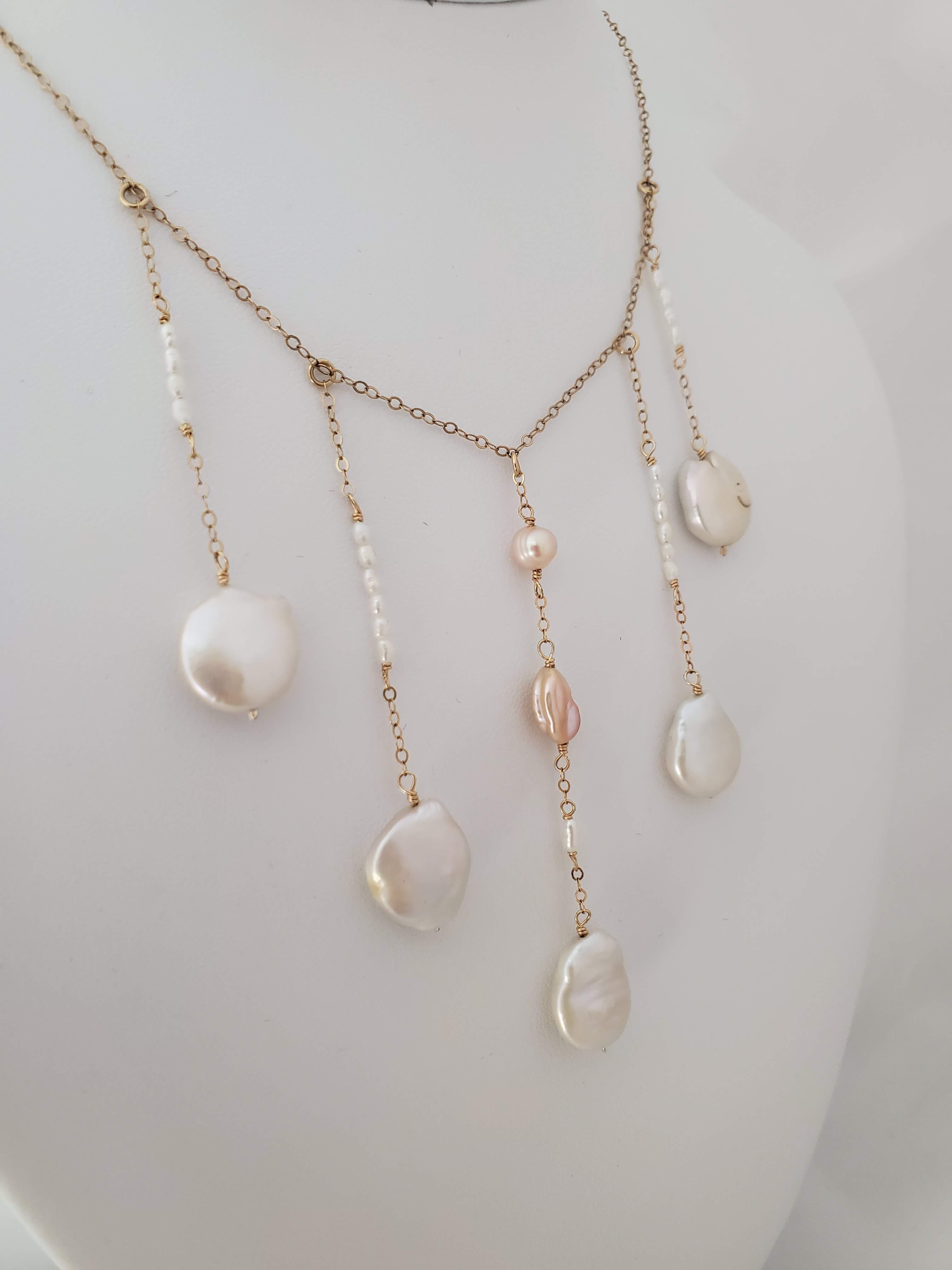 Button, Golden Keshi, metallic and seed pearls on adjustable gold fill flat cable chain.