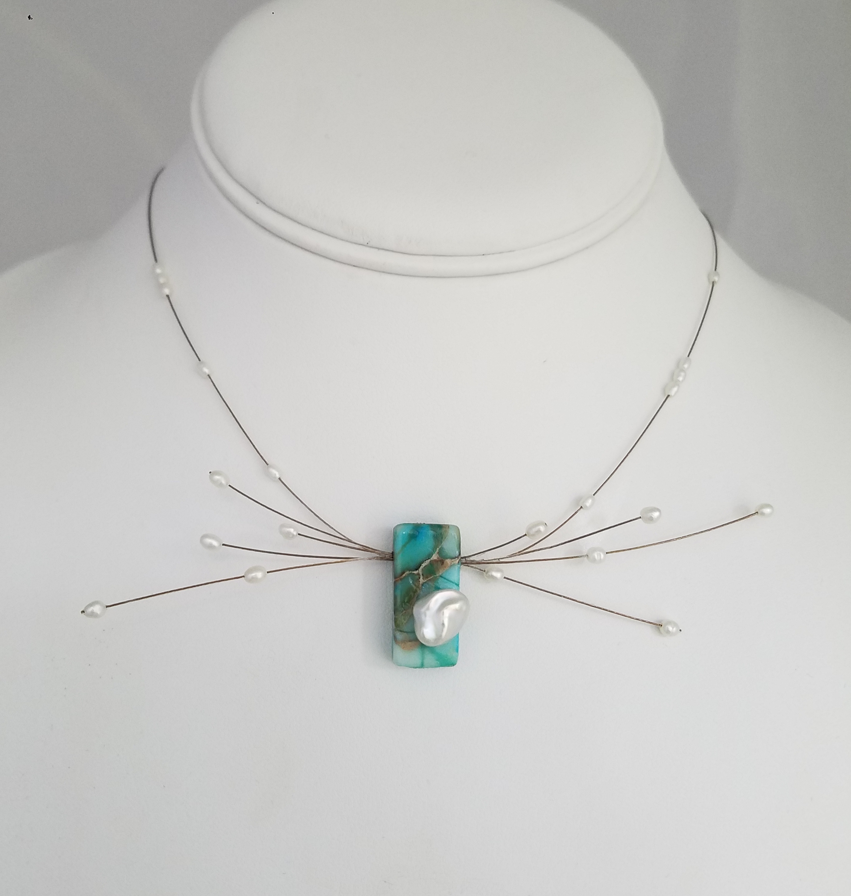 Semilrecious stone , Keshi pearl, seed pearls, flex wire.