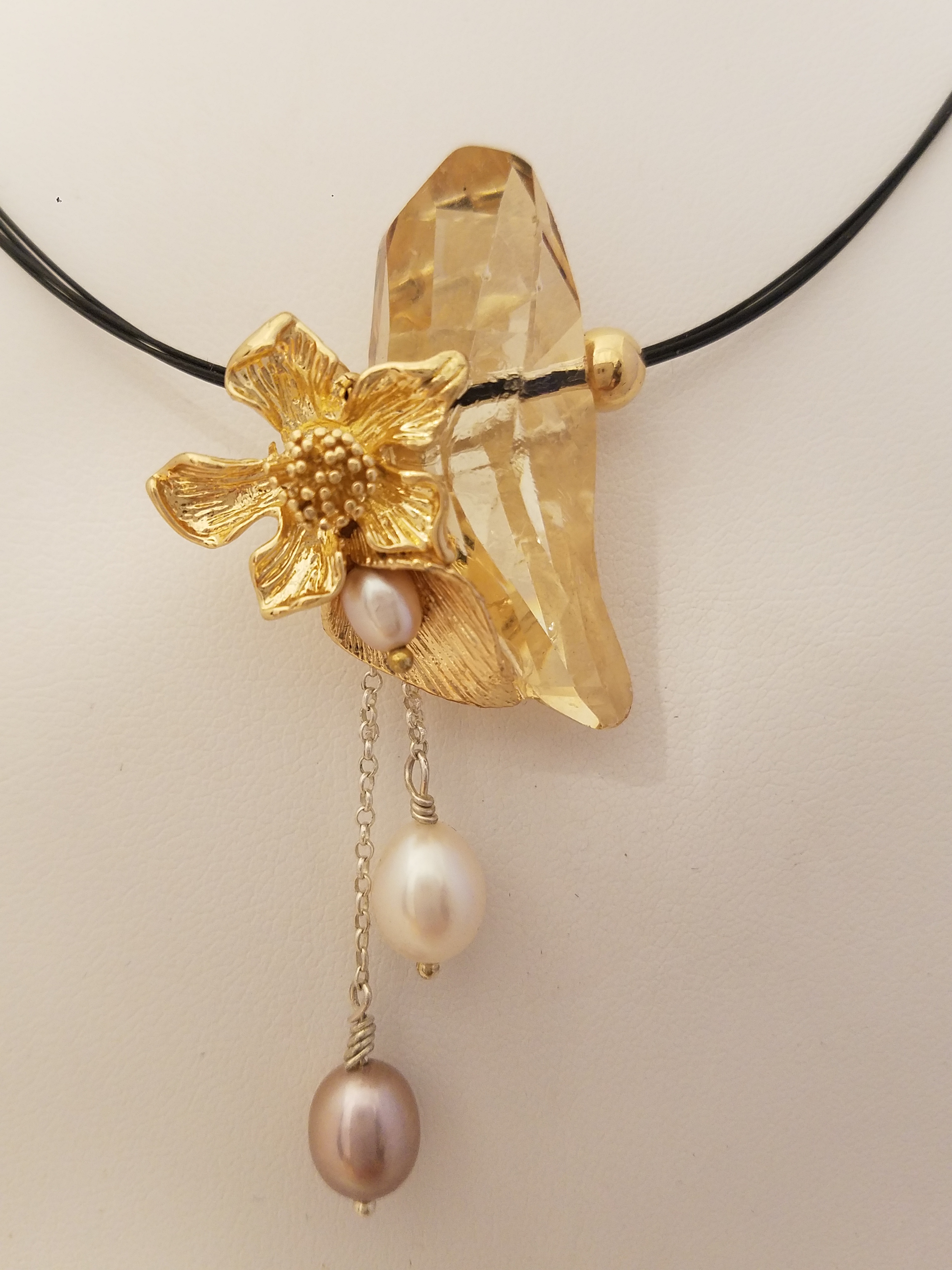 A cluster of Zwarowsky, gold filled flowers, chain and metallic luster oval pearls. It sits on black stainless steel wire.