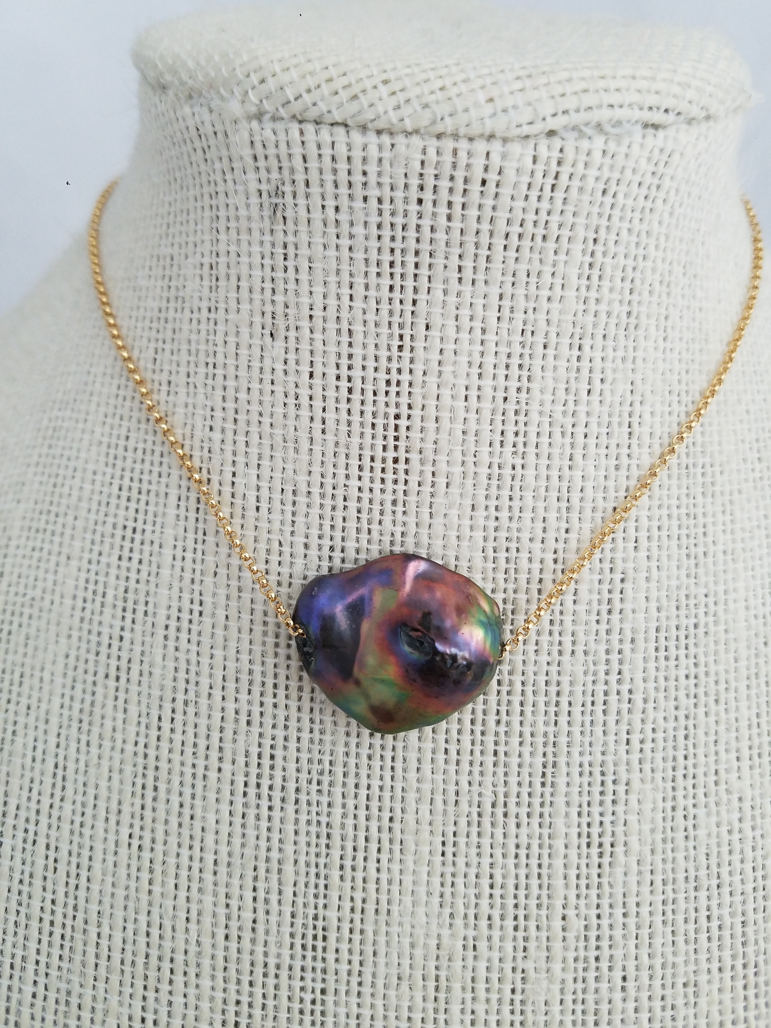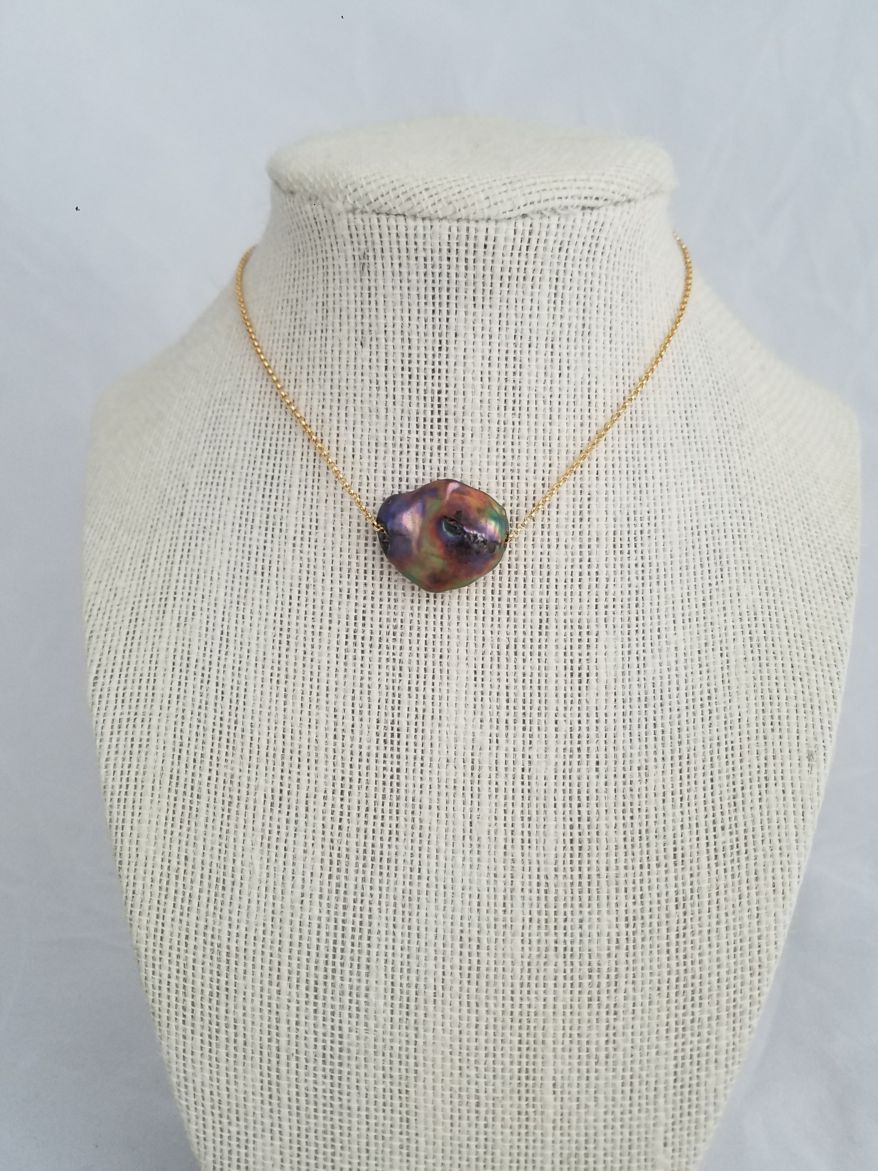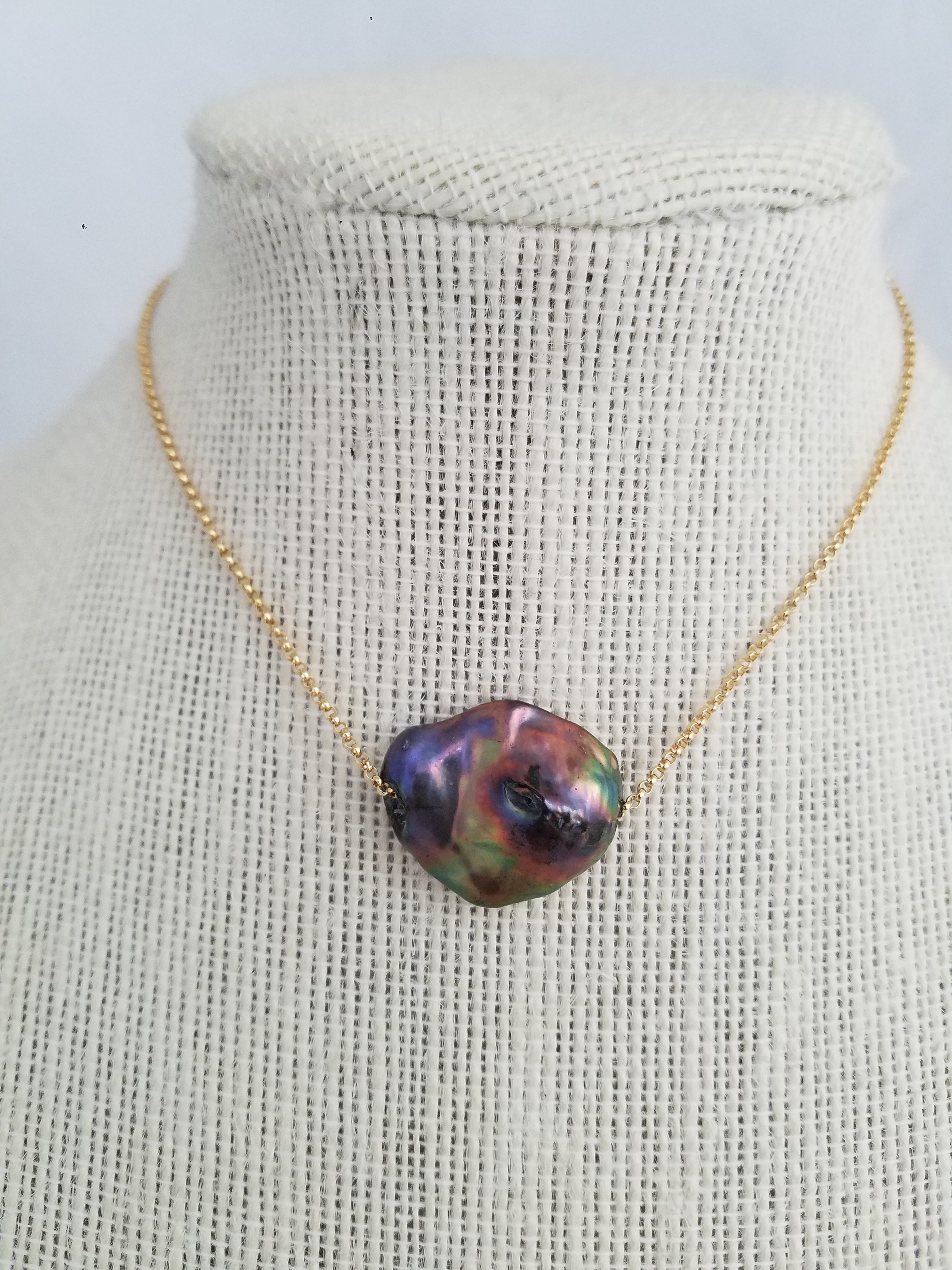 Rainbow luster black Keshi pearl on gold fill 1.5 mm chain 16" extendable to 18"
