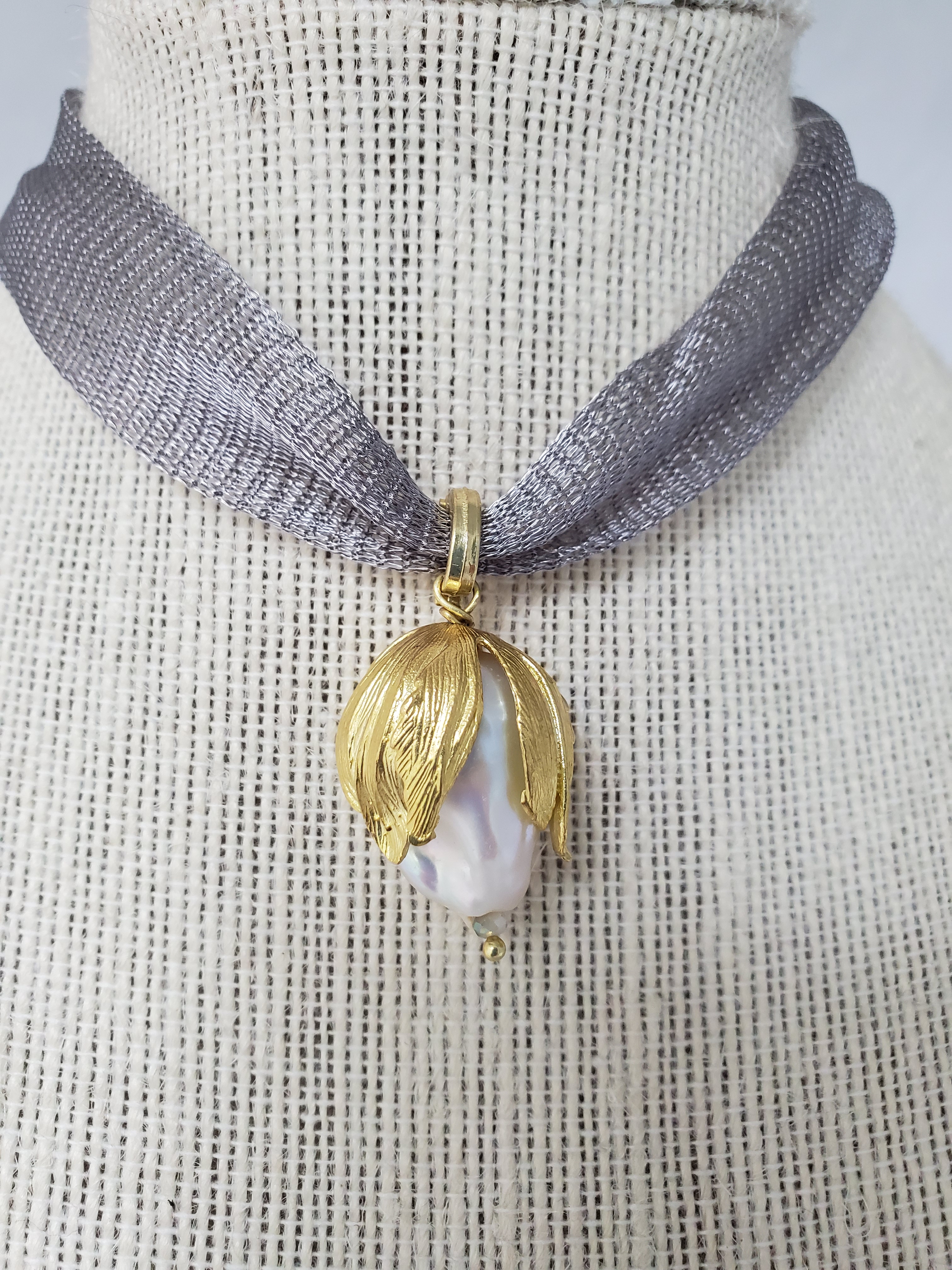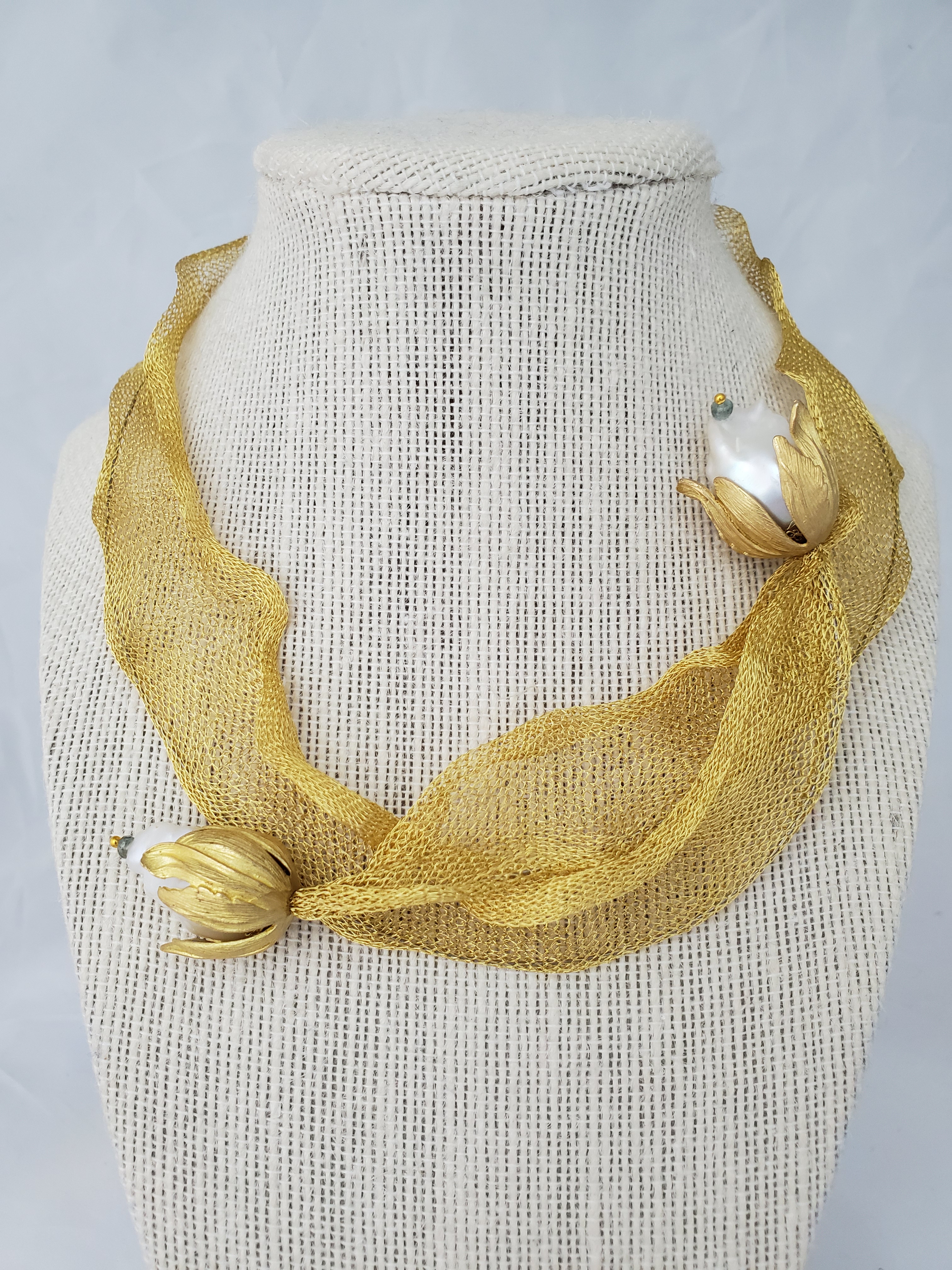 Brass gold plated tulip, white Flameball pearl. Titanium mesh