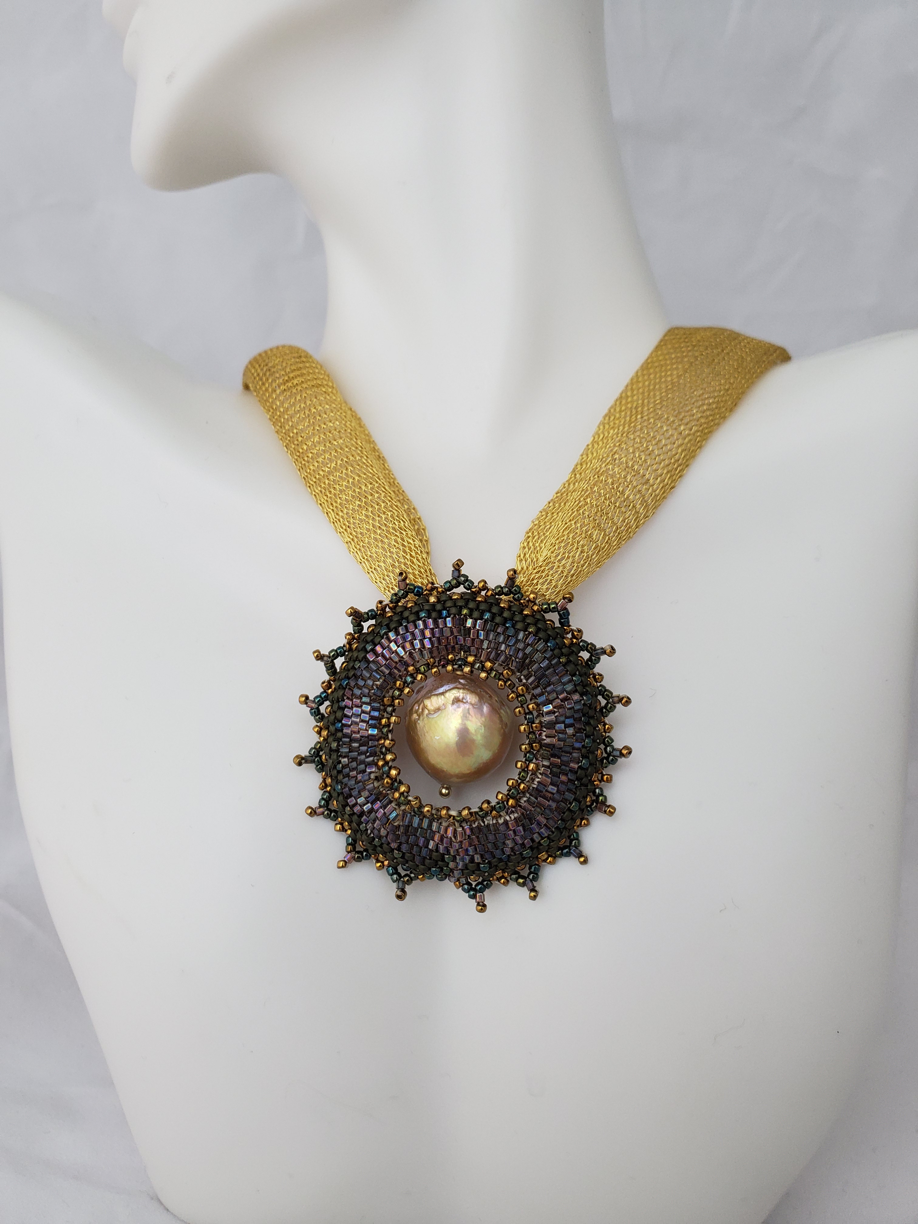 2 Flameball, 1 keshi pearl and some small pearls are hidden inside mesh with several oval metallic pearls on the surface