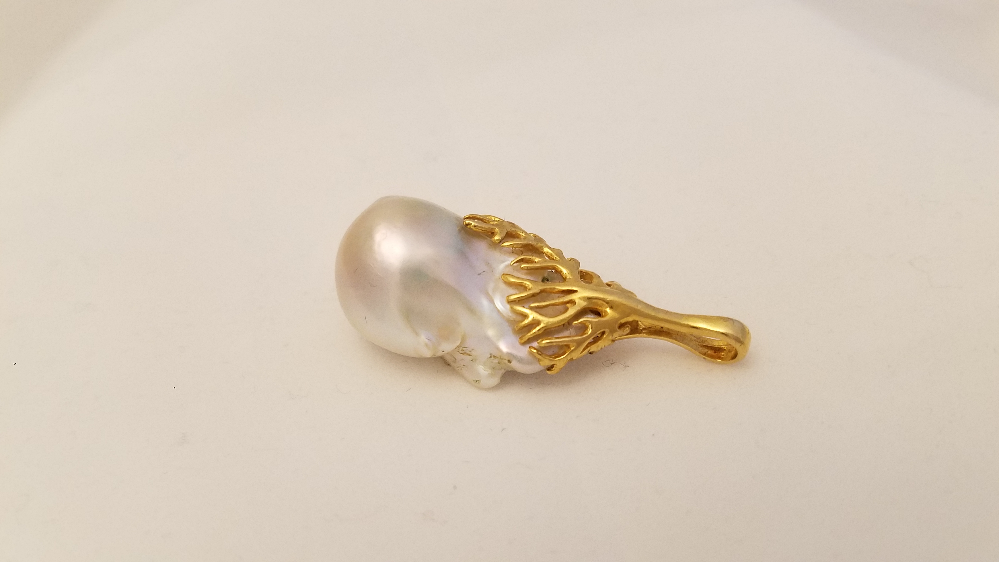 Beautiful Flameball pearl, Sterling Silver gold plated bail Optional accessories: Sterling silver gold plated wheat spiga chain, Leather 3mm wide bronze or gold colored with gold fill and SS components.
